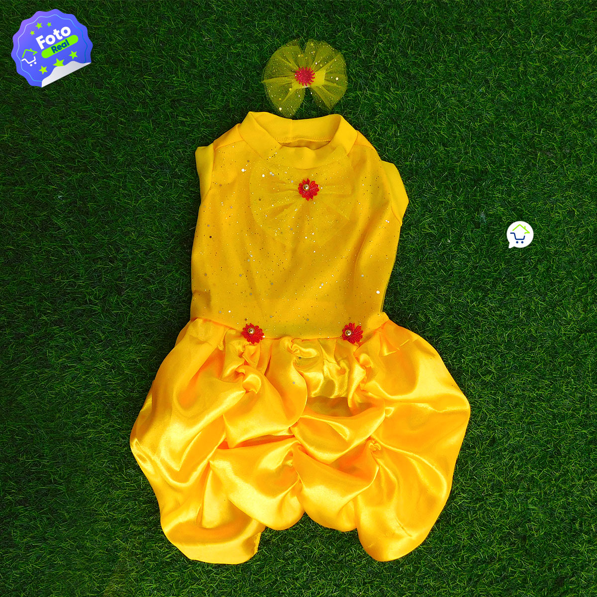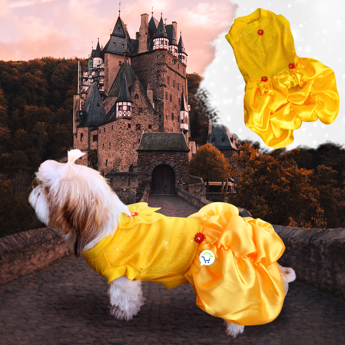 Haz que tu mascota luzca como toda una princesa Bella con este encantador disfraz inspirado en el clásico vestido amarillo. Ideal para Halloween, fiestas, sesiones de fotos o para que robe todas las miradas en un paseo especial. 🐾💛